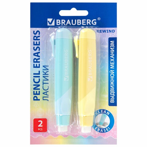 Ластики выдвижные BRAUBERG "REWIND", 2 ШТУКИ, 112х21х24 мм, белые, пастельные цвета корпуса, блистер, 272687