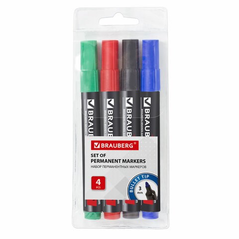 Маркеры перманентные BRAUBERG "Contract", НАБОР 4 ЦВЕТА, круглый наконечник 3 мм, 150474