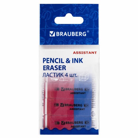 Набор из четырех ластиков BRAUBERG "Assistant 80", предназначенных для удаления надписей, сделанных чернографитными карандашами.
