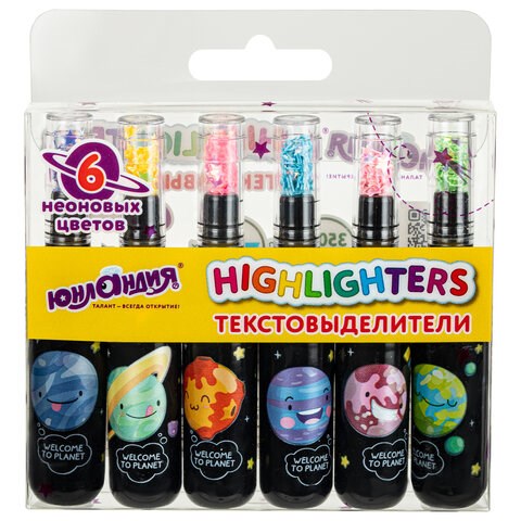 Набор текстовыделителей 6 НЕОНОВЫХ ЦВЕТОВ, ЮНЛАНДИЯ "КОСМОС", линия 1-5 мм, 152512