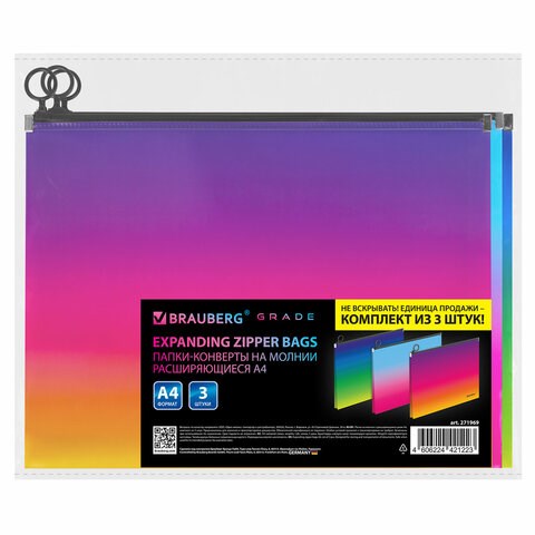 Папка-конверт расширяющаяся СУПЕР КОМПЛЕКТ 3 ШТ. на молнии BRAUBERG "Grade", А4 градиент 0,18 мм, 271969