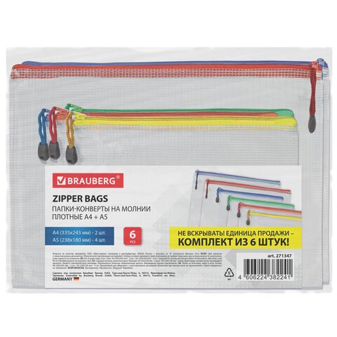 Папка-конверт СУПЕР КОМПЛЕКТ на молнии ПЛОТНЫЕ, 6 шт. (А4 - 2 шт., А5 - 4 шт.), сетчатая, BRAUBERG, 271347