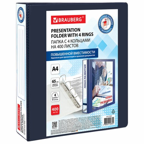 Папка ПАНОРАМА на 4 кольцах, ПРОЧНАЯ, картон/ПВХ, BRAUBERG "Office", СИНЯЯ, 65 мм, до 400 листов, 271851