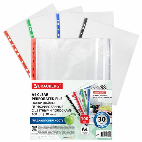 Перфорированные папки-файлы BRAUBERG с цветными полосками предназначены для хранения документов в папке с любым кольцевым механизмом или скоросшивателем.