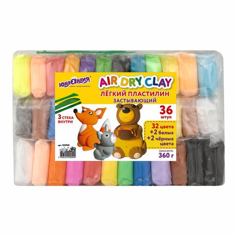 Пластилин супер легкий воздушный 36 шт. (32 цвета +2 белых + 2 черных) 360 г, 3 стека, ЮНЛАНДИЯ, 105908