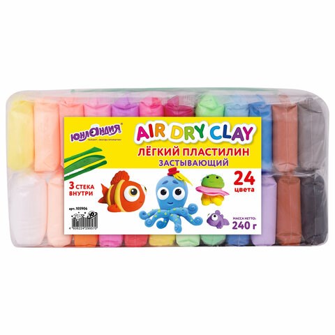 Пластилин супер легкий воздушный застывающий 24 цвета, 240 г, 3 стека, ЮНЛАНДИЯ, 105906