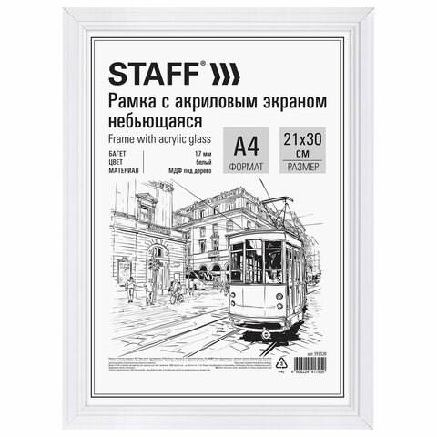 Рамка 21х30 см небьющаяся, багет 17 мм МДФ под дерево, STAFF "Carven", белая, 391320