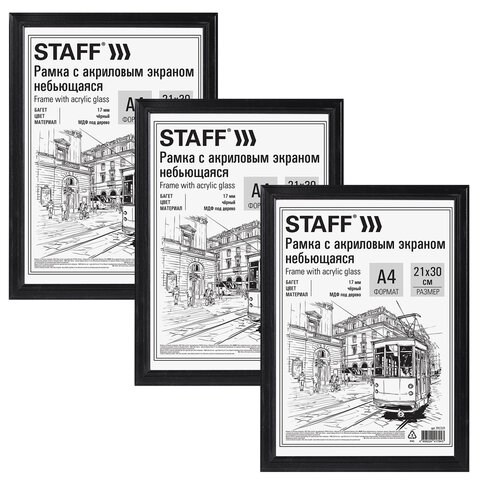 Рамка 21х30 см небьющаяся, КОМПЛЕКТ 3 шт., багет 17 мм МДФ, STAFF "Carven", черная, 391324