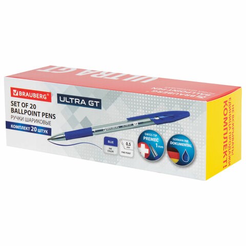 Ручка шариковая с грипом BRAUBERG "ULTRA GT", КОМПЛЕКТ 20 ШТУК, СИНЯЯ, линия 0,5 мм, 144059