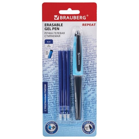 Ручка стираемая гелевая с эргономичным грипом BRAUBERG REPEAT, СИНЯЯ, +3 сменных стержня, узел 0,7 мм, линия письма 0,5 мм, 143663