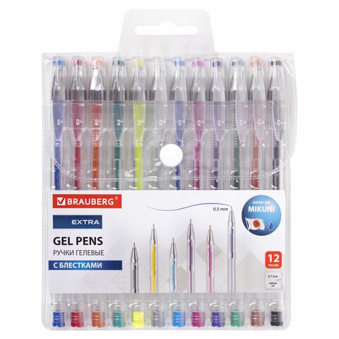 Ручки гелевые БЛЕСТКИ BRAUBERG "EXTRA", НАБОР 12 ЦВЕТОВ, узел 0,7 мм, линия 0,5 мм, 143909