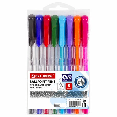 Ручки шариковые масляные BRAUBERG, НАБОР 8 шт., АССОРТИ, "Extra Glide", узел 1 мм, линия письма 0,5 мм, 142140