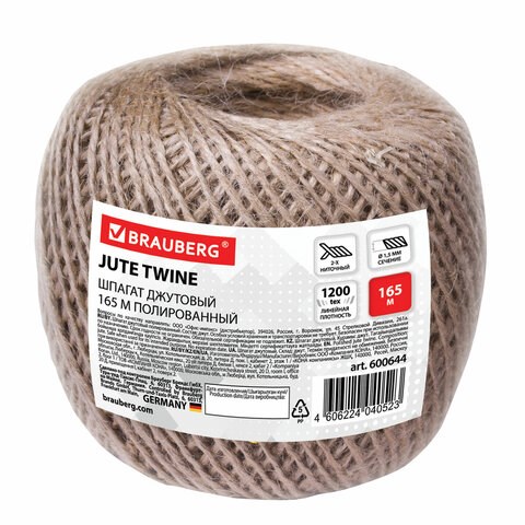 Шпагат джутовый банковский полированный, длина 165 м, диаметр 1,5 мм, линейная плотность 1200 текс, BRAUBERG, 600644
