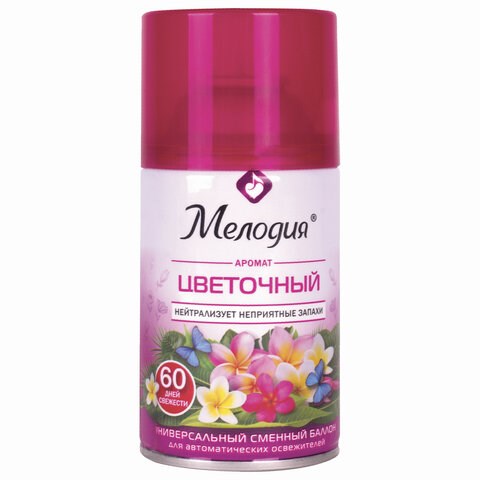 Сменный баллон МЕЛОДИЯ "Цветочный" быстро и эффективно устраняет неприятные запахи и освежает воздух в жилых и бытовых помещениях. Имеет приятный стойкий аромат, который надолго наполнит помещение свежестью.