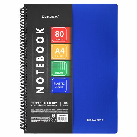 Тетрадь А4 80 л. BRAUBERG "Metropolis", спираль пластиковая, клетка, обложка пластик, СИНИЙ, 404741