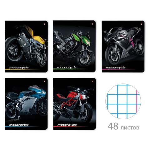 Тетрадь А5 48 л. АЛЬТ скоба, клетка, глянцевый лак, "Спортивные мотоциклы" (5 видов), 7-48-844