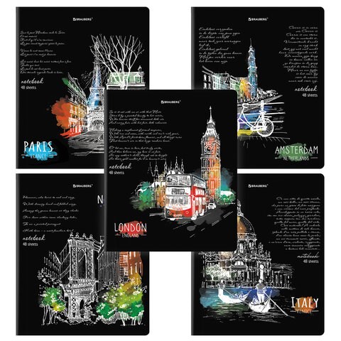 Тетрадь А5, 48 л., BRAUBERG, скоба, клетка, глянцевый лак, "Города" (микс в спайке), 404346