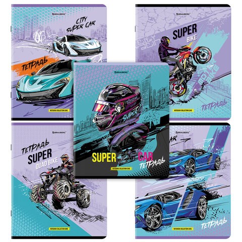 Тетрадь А5, 48 л., BRAUBERG, скоба, клетка, глянцевый лак, "Race" (микс в спайке), 404349