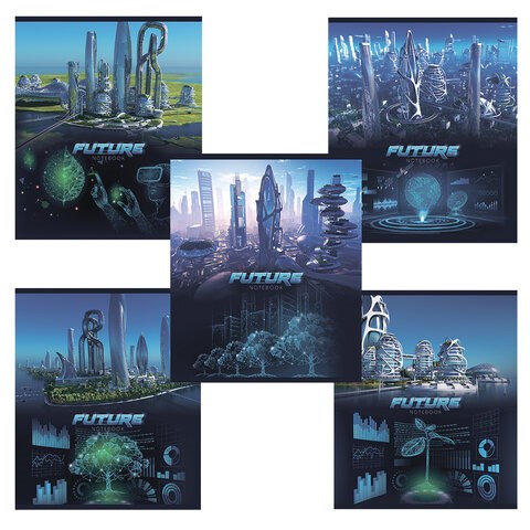 Тетрадь А5, 48 л., ПЗБМ, скоба, клетка, ламинация, фольга, выборочный лак, "Города будущего" (5 видов), 029623