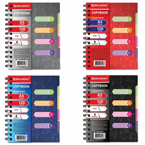 Тетрадь-блокнот 120 л., A5, 170x215 мм, BRAUBERG, линия, гребень, обложка пластиковая, 4 разделителя, "Rich", 401791