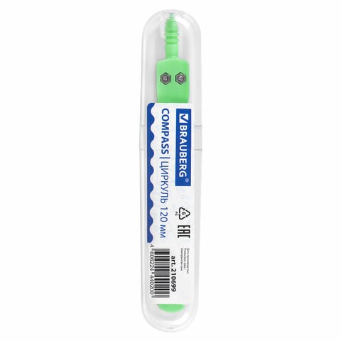 Циркуль BRAUBERG GEOMETRY, 120 мм, пастельно-зеленый цвет, защитный колпачок, пластиковый пенал, 210699