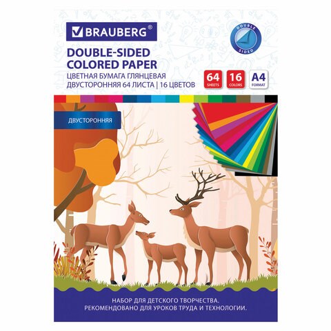 Цветная бумага А4 2-сторонняя мелованная, 64 листа 16 цветов, склейка, BRAUBERG, 200х280 мм, "Олени", 115172