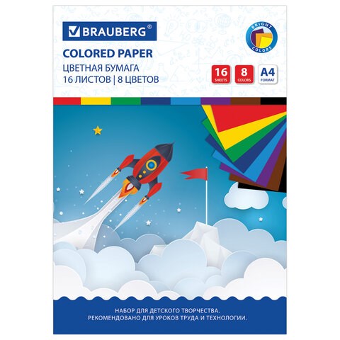 Цветная бумага А4 офсетная, 16 листов 8 цветов, на скобе, BRAUBERG, 200х275 мм, "Космос", 129919