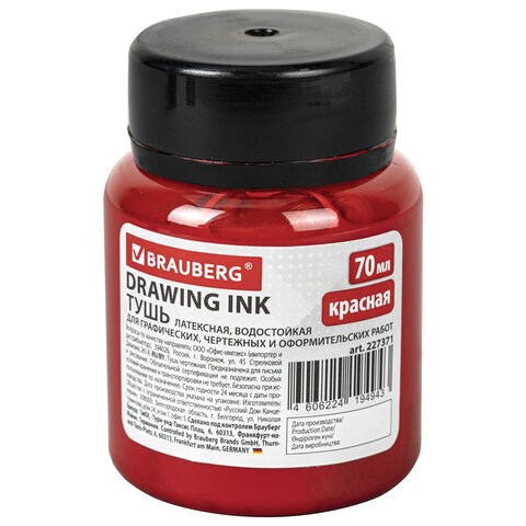 Тушь чертежная BRAUBERG, 70 мл, красная, водостойкая, латексная (черчение, графика, оформление), 227371