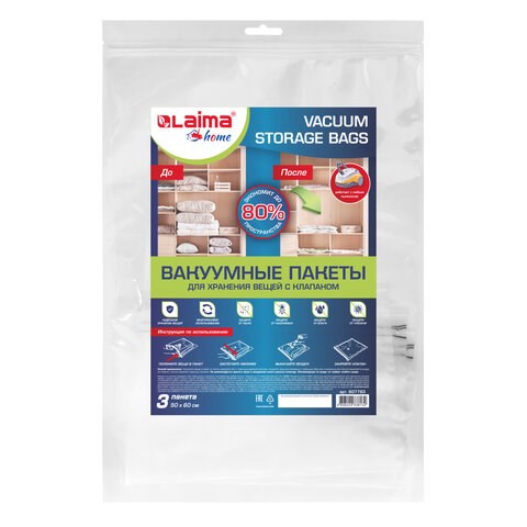 Вакуумный пакет с клапаном для хранения вещей 50х60 см, КОМПЛЕКТ 3 шт., LAIMA HOME, 607783