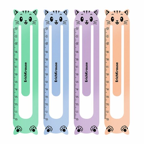 Закладки для книг пластиковые ERICH KRAUSE "Кошки", набор 4 шт., шкала 12 см, ассорти, 0,6 мм, 61228